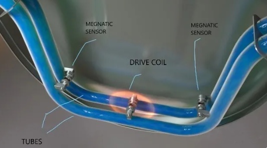 這里兩個平行的 U 形管安裝在儀表內。驅動線圈將使管子以固有頻率振蕩。兩個傳感器安裝在入口和出口處,傳感器將精確測量頻率和振蕩。當沒有流體流過管道時,管道會以固有頻率振蕩,這種情況稱為同相。傳感器產生的正弦波對于兩個管都是相同的。