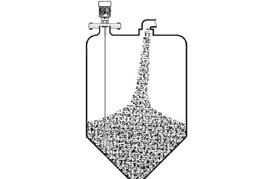 如果雷達料位計安裝在進料口太近的位置,常會在進料時出現(xiàn)料位上下跳動或測量值死在最高值等現(xiàn)象。重新選取安裝位置,避開進料口后,儀表基本上能穩(wěn)定測量。