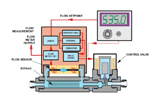 2. 控制部分:溫度檢測元件感知到的溫度變化信號被轉換為電信號,并與預設的流量設定值進行比較。控制器根據比較結果調整加熱元件的加熱功率,以保持加熱元件周圍溫度恒定,從而實現對氣體質量流量的精確控制。