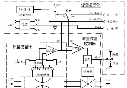 分流器決定主通道的流量。與質(zhì)量流量控制器配套的流量顯示儀上設(shè)置有穩(wěn)壓電源,數(shù)字電壓表, 設(shè)定電位器, 外設(shè)、內(nèi)設(shè)轉(zhuǎn)換和三位閥控開(kāi)關(guān)等。氣體質(zhì)量流量控制器與流量顯示儀連接后的工作原理。