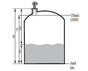 通過(guò)輸入空罐高度E(=零點(diǎn)),滿(mǎn)罐高度F(=滿(mǎn)量程)及一些應(yīng)用參數(shù)來(lái)設(shè)定,應(yīng)用參