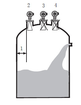 ● 建議距離(1)罐體內(nèi)壁至安裝短管的外壁應(yīng)大于罐直徑的1/6;● 離罐壁Z小距離為300mm;● 不能安裝在入料口的上方(4)?!?不能安裝在中心位置(3),如果安裝在中央,會(huì)產(chǎn)生多重虛假回波,干擾回波會(huì)導(dǎo)致信號(hào)丟失?!?如果不能保持儀表與罐壁的距離,罐壁上的介質(zhì)會(huì)黏附造成虛假回波,在調(diào)試儀表的時(shí)候應(yīng)該進(jìn)行虛假回波存儲(chǔ)。 3.2 罐內(nèi)安裝
