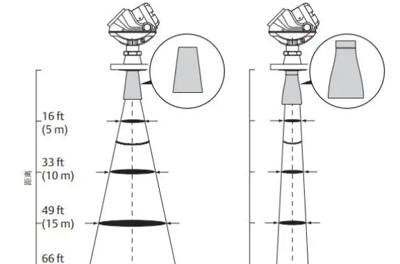 雷達(dá)液位計的總波束寬度與設(shè)備的頻率成反比。因此對于同一直徑的天線,如果雷達(dá)液位計的頻率提高,波束寬度將低于較低頻率的設(shè)備,狹窄的波束可將管嘴、罐壁和干擾物的影響降至最低。如下圖所示(左側(cè)是6 GHZ的,右側(cè)為26GHZ的)。